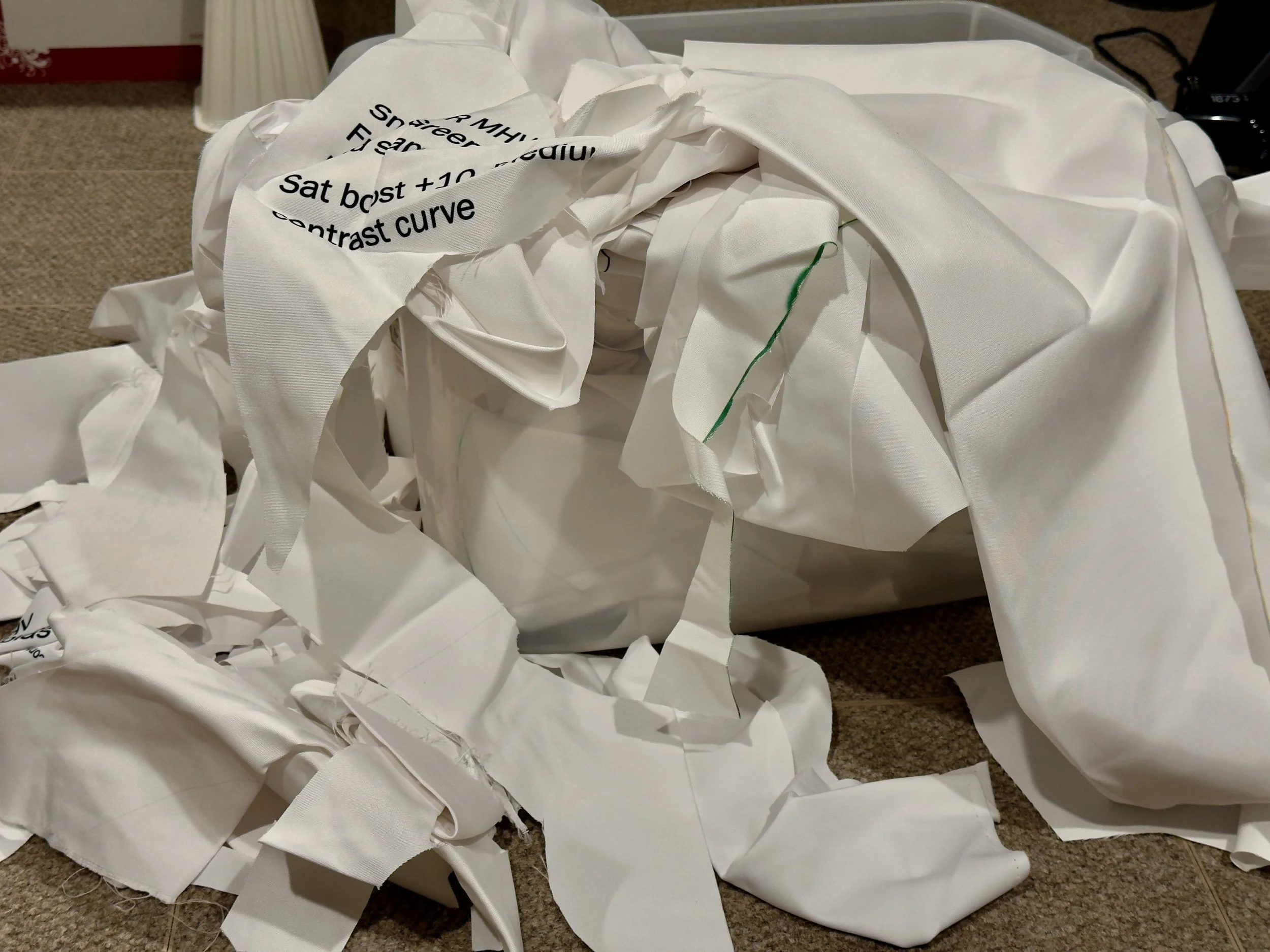In this process, I found a bin filled with 25 pounds of leftover fabric from the Marine Heatwave project. A requirement for displaying my kinetic sculptures in public spaces was that the fabric be treated with fire-retardant chemicals. There was no way I could in good conscience put these 25 pounds of duck cloth in the landfill. Fortunately, Retold, a service for recycling sewing scraps, gave me a “good karma” home for my bin of fabric. What a relief… now just a million more things to clear out…
